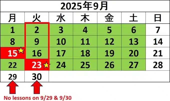 Hello!いつもお世話になっております。先週のレッスン時に担当の先生からご案内があったかと思いますが、念のため改めてお知らせいたします。年間スケジュールに基づき、年間授業日数の調整のため、9月29日(月)と30日(火)のレッスンはお休みとなります。 どうぞよろしくお願いいたします。 Thank you always for your understanding!